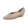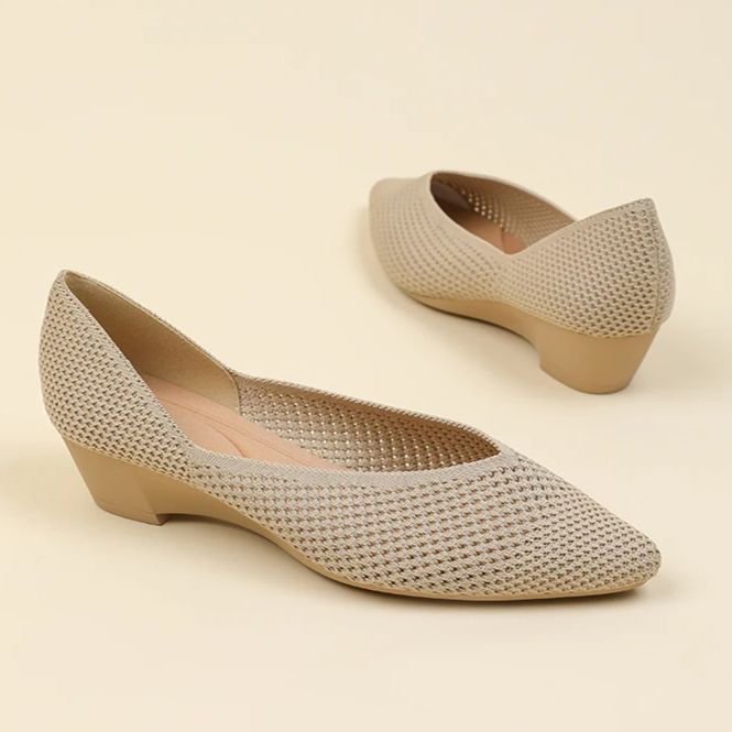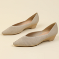 O salto baixo em formato de cunha garante equilíbrio e conforto prolongado, enquanto o bico fino traz um toque refinado e moderno ao visual.