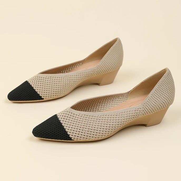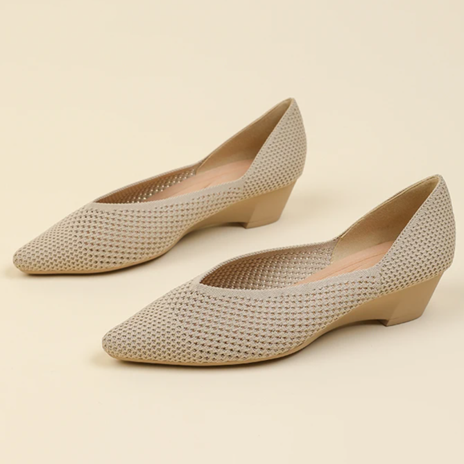A Loretta combina o conforto do salto cunha com a elegância atemporal da malha tricô.